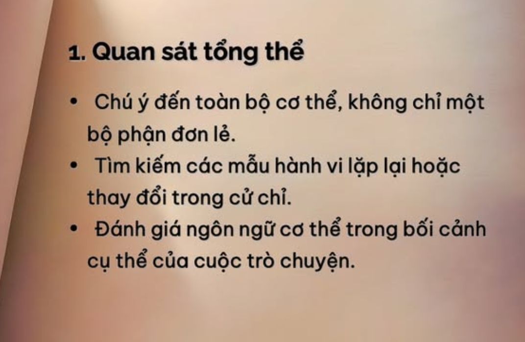 Sai lầm lớn nhất của những người mới bắt đầu học về ngôn ngữ cơ thể là cố gắng giải mã từng cử chỉ riêng lẻ như một từ điển. Ví dụ: “Khoanh tay nghĩa là phòng thủ”. Điều này không sai, nhưng chưa đủ. Để hiểu đúng, bạn cần một tư duy quan sát toàn diện.